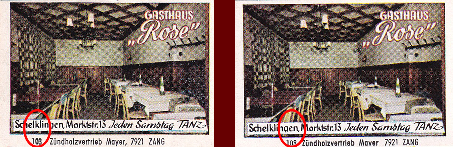 Unter uns Sammlern bilden die Gasthausetiketten eine eigene Rubrik. Einige sammeln sie gar nicht, andere sammeln sie nur. Glaubt man zunächst, wenn man ein Etikett neben das bereits vorhanden legt, sie sind gleich, kann man häufig bei genauem betrachten noch Unterschiede finden. Am schnellsten geht das oft, wenn man die aufgedruckte „Werbezeile“ anschaut. Hier gibt es oft ganz unterschiedliche Informationen. Mal mit, mal ohne Steuernummer. Mal mit Inhaltsangabe 38 Hölzer, mal mit 40 Hölzer. Oft gibt es Buchstaben oder Zahlen auf der rechten Seite der Werbezeile die sich unterscheiden. Manche Etiketten haben in der Werbezeile einen senkrechten Strich. Dieser kann auch an verschiedenen Stellen stehen, oder auch selber unterschiedlich klein, groß, dick oder dünn sein.