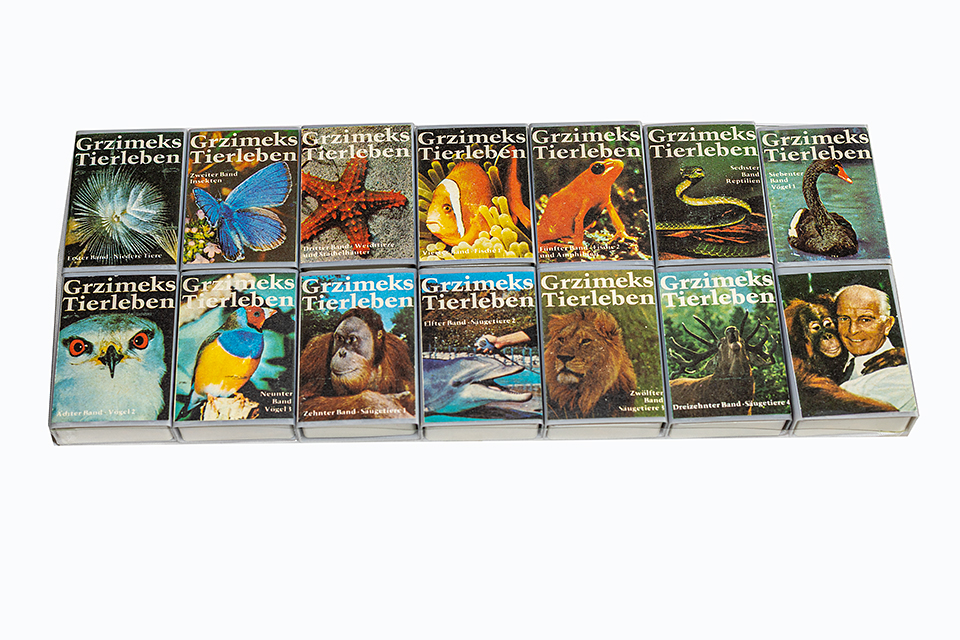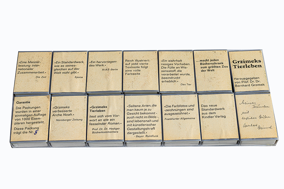 Im Zündholzetiketten Katalog Teil 1 Serien, Band 1 Serien bis 1968, von Klaus Busch, sind unter den Nummern 5407 bis 5434 die Vor- und Rückseiten der sehr seltenen Ausgabe von Grzimeks Tierleben aufgeführt. Es handelt sich hierbei um 14 Plastikschachteln mit aufgeklebten Etiketten. Wobei die schwarz-weißen Textetiketten die Deckeletiketten sind und die Steuernummer 7 tragen. Die bunten Fotoetiketten sind die Rückseiten und haben keine Steuernummer. Die Schieber mit den Hölzern sind entsprechend in die Schachteln eingeschoben. Für mich ist das sehr ungewohnt, da ich die bunten Rückseiten immer nach oben halte und für die eigentlichen Deckeletiketten halte.